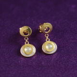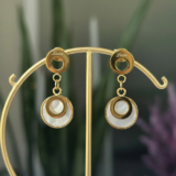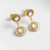 El diseño presenta dos círculos entrelazados o superpuestos, uno de ellos delicadamente adornado con nácar (madreperla), que ofrece un brillo iridiscente y natural, y el otro con un pulido acabado dorado. Largo Aros 2,5 cm