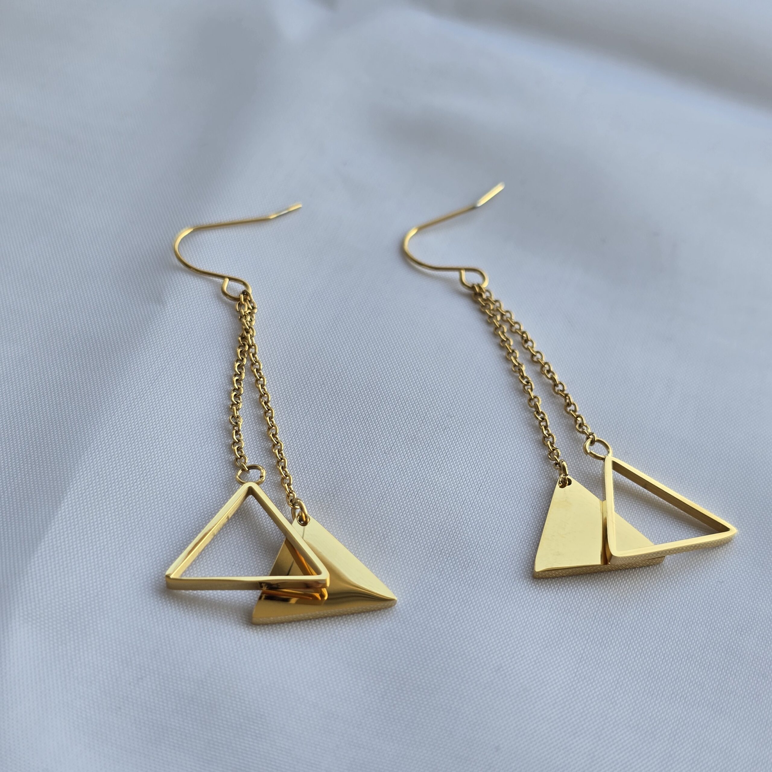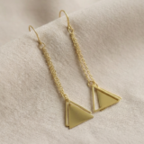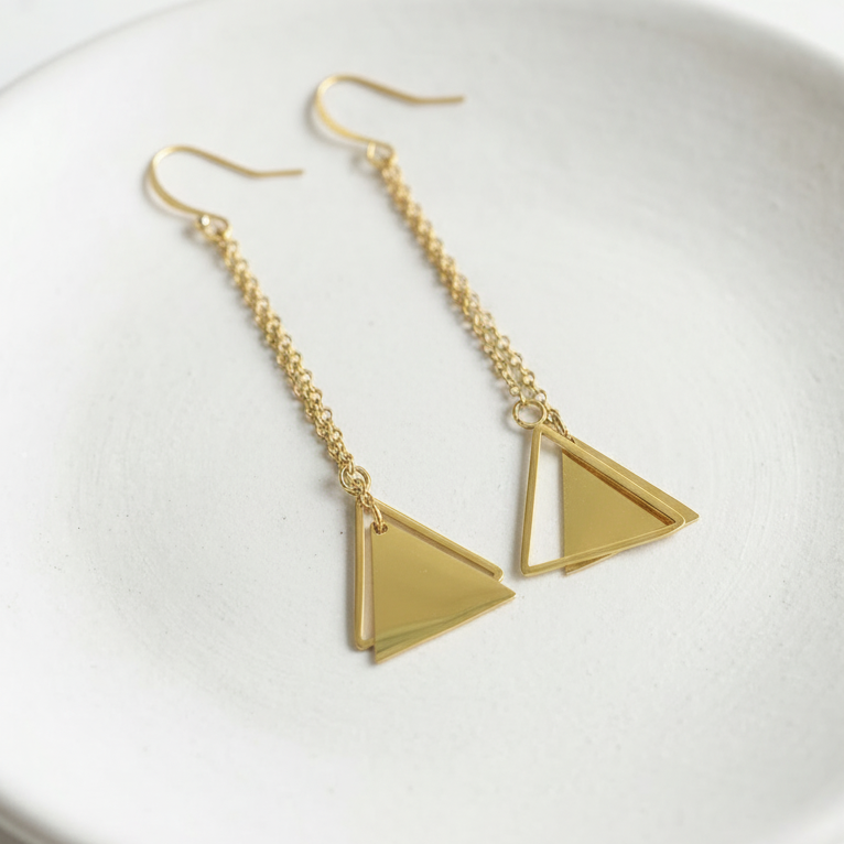 El diseño presenta una delicada cadena larga que termina en un moderno doble triángulo, creando un punto focal llamativo y contemporáneo. Con una longitud total de 6 cm, son perfectos para estilizar el cuello y añadir un brillo sutil y sofisticado.