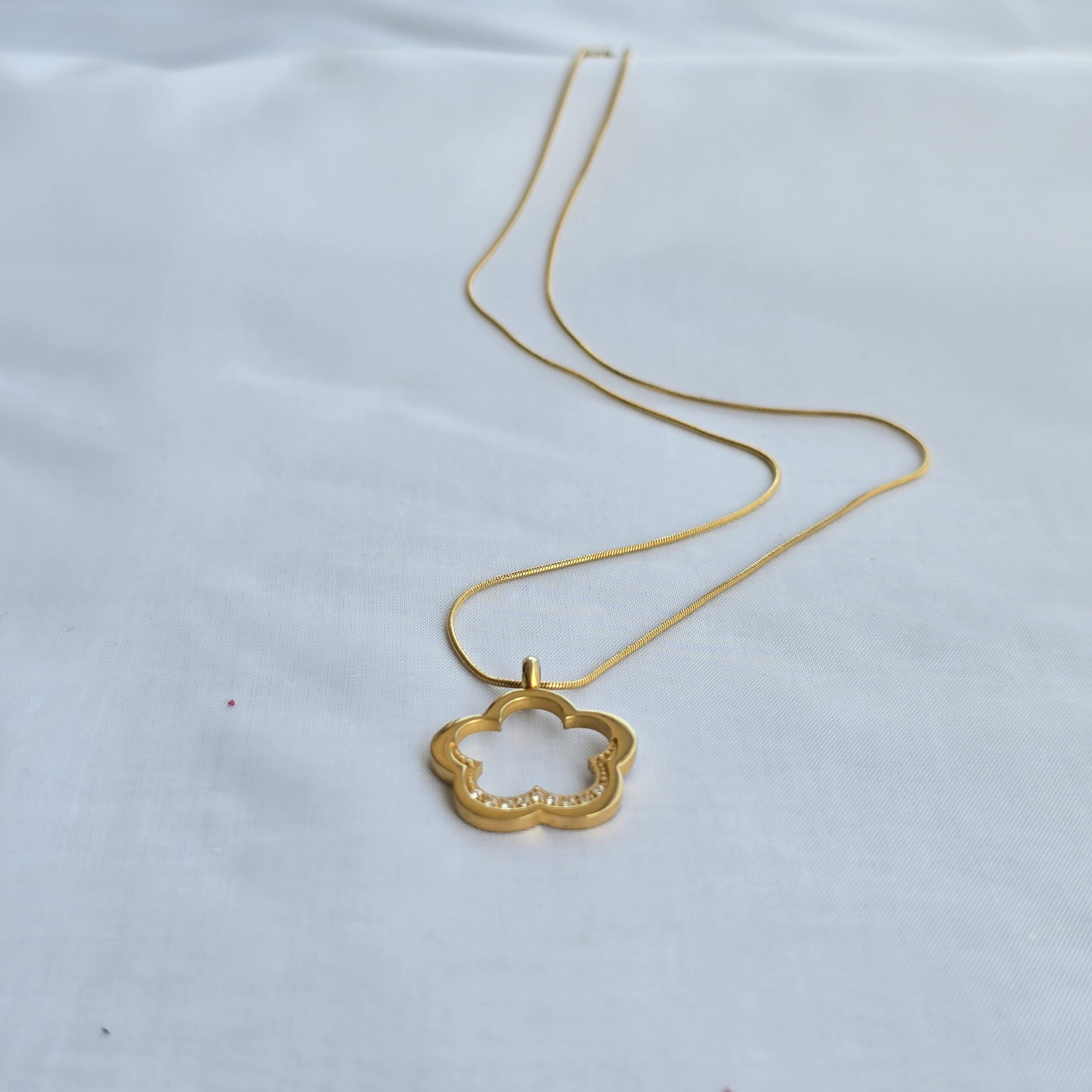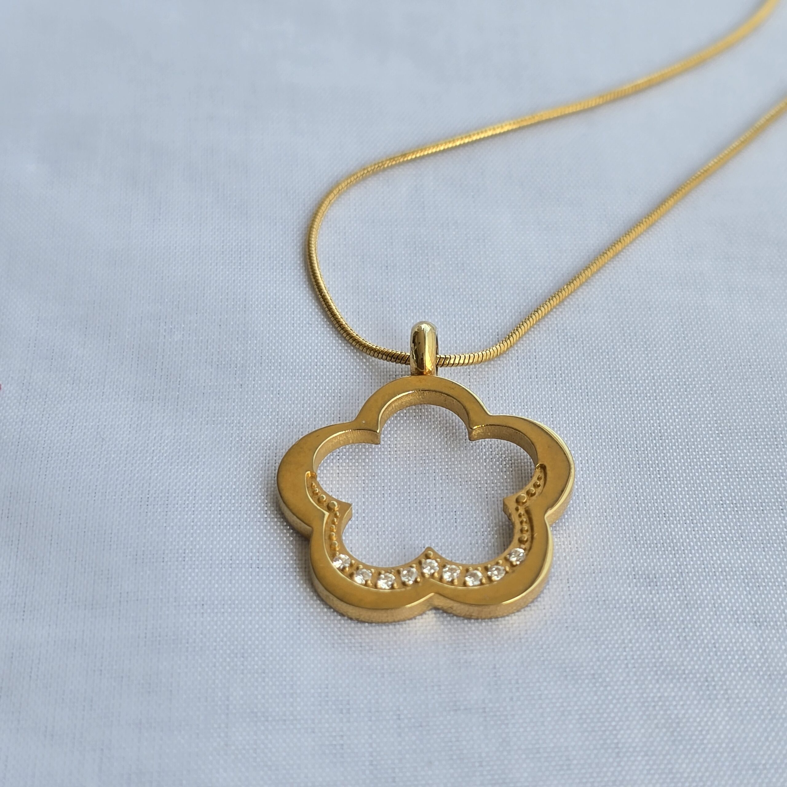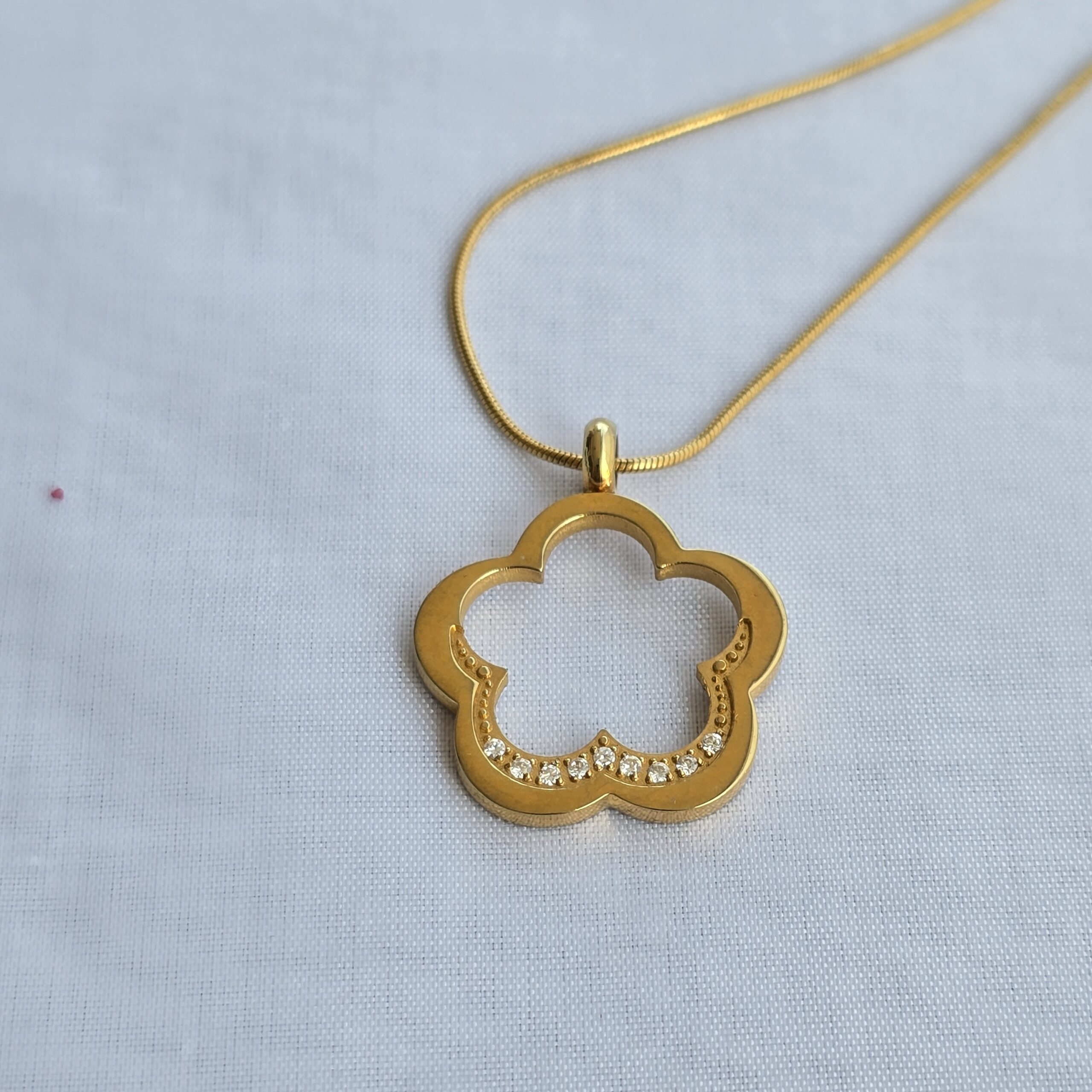 El protagonista es un llamativo colgante de trébol de cinco hojas (2.5 cm), una rareza que simboliza la fortuna, el éxito y la prosperidad. Adornada con circones brillantes que capturan la luz de manera deslumbrante.