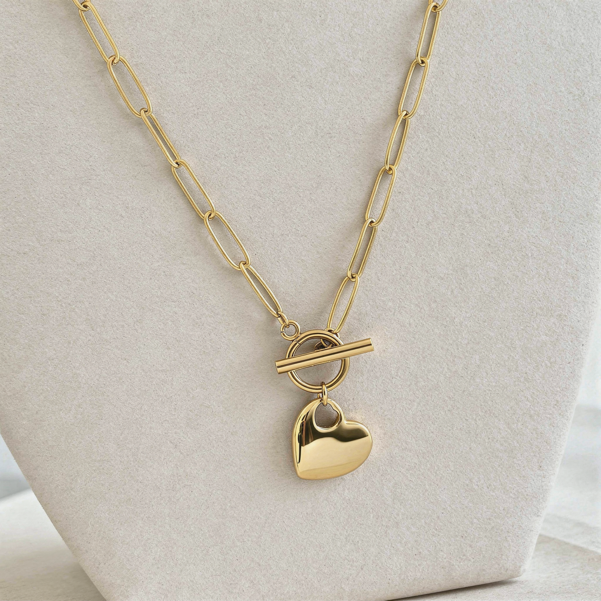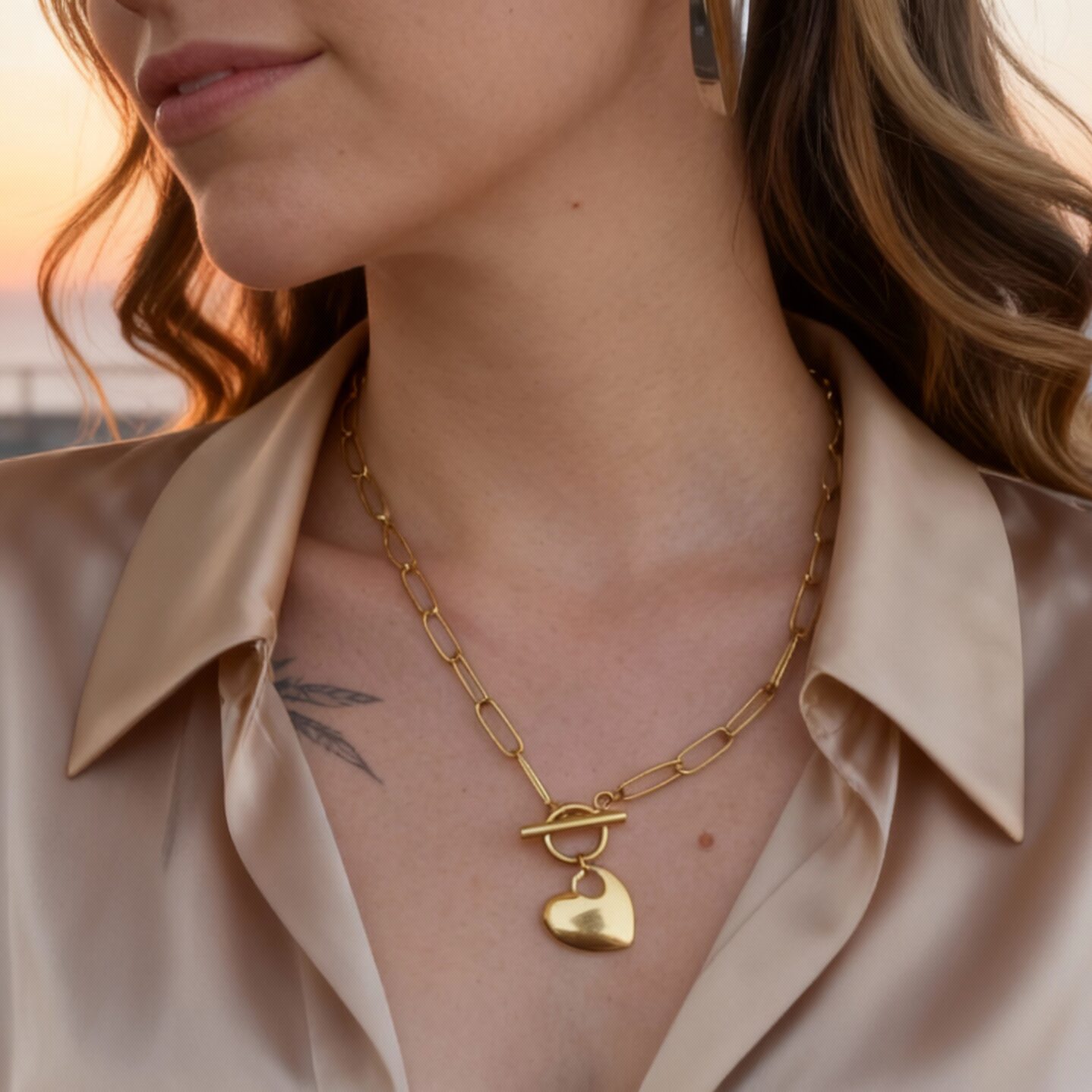 Haz una declaración de estilo audaz y romántico con este collar de cadena de eslabones de tendencia. Su diseño innovador presenta un elegante cierre delantero que funciona como el punto focal de la joya, enmarcando un encantador colgante de corazón.