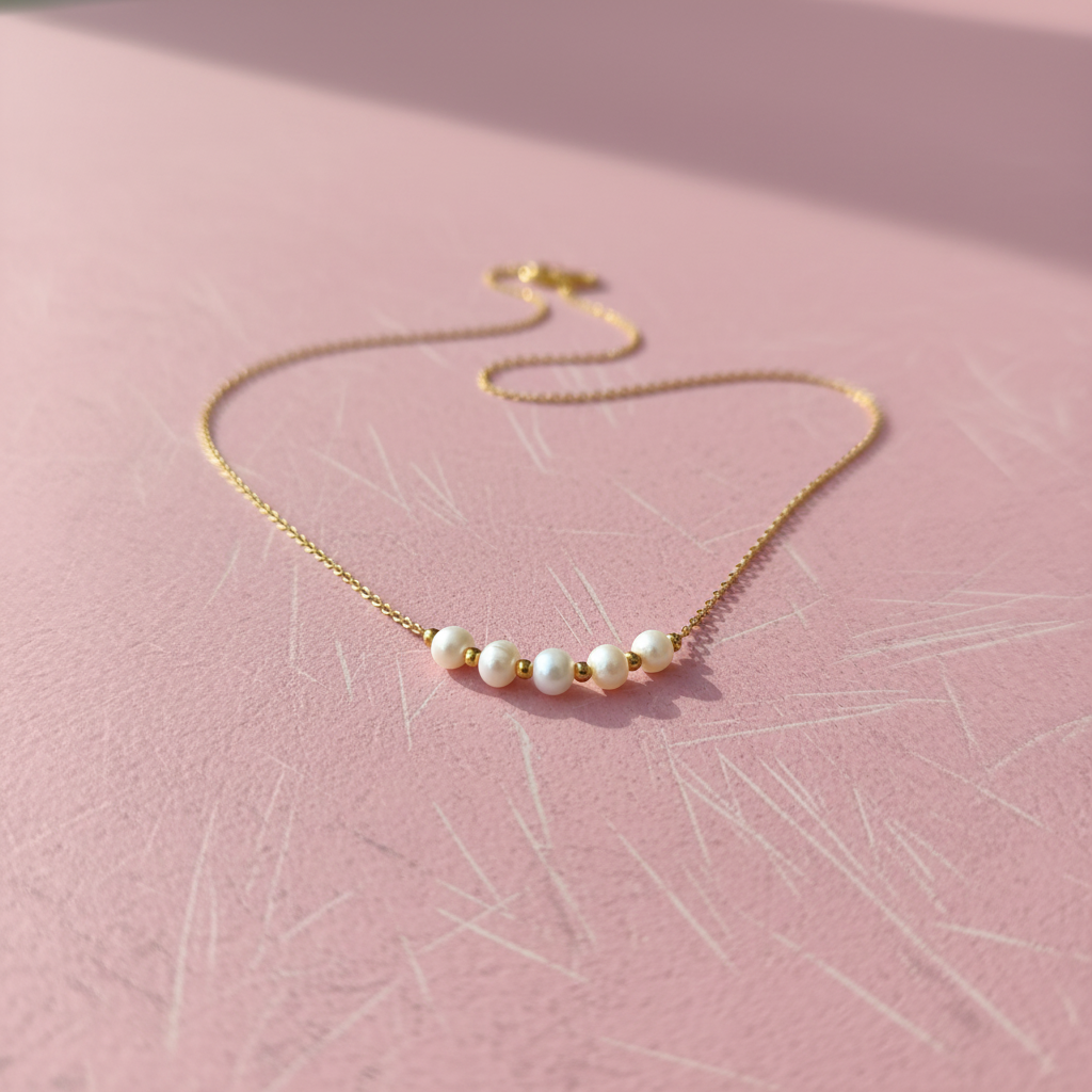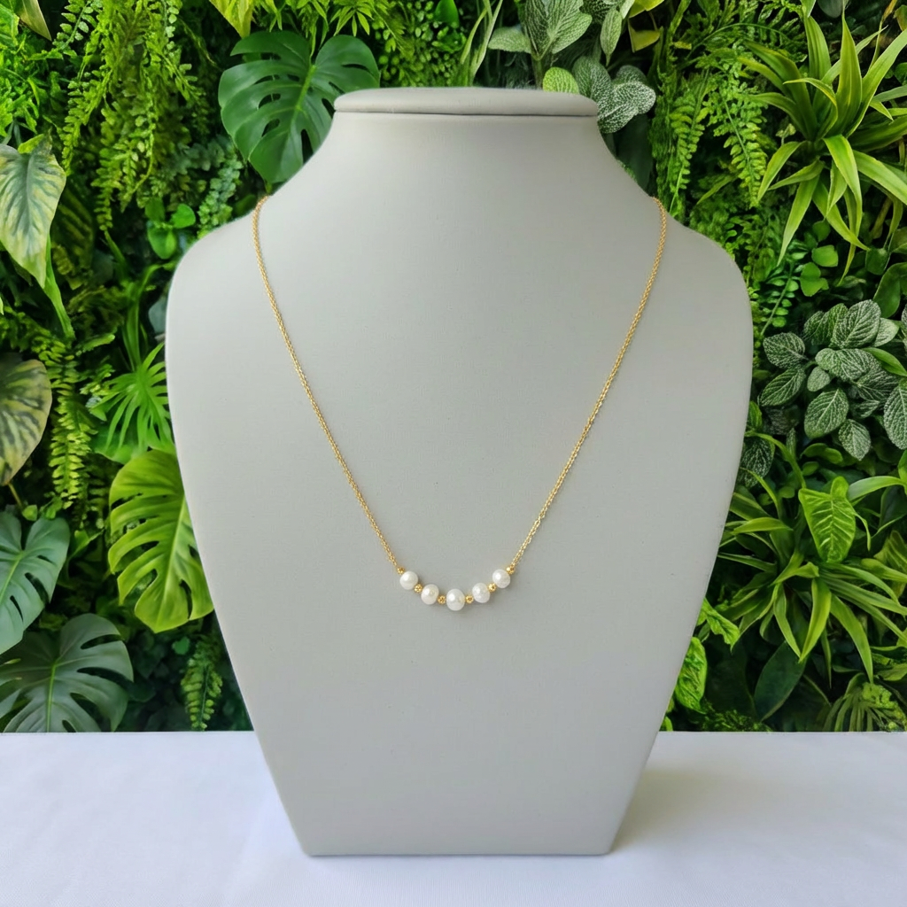 Collar de acero en tono dorado, con un acabado pulido que aporta un brillo cálido. En la parte inferior, cinco perlas blancas de fantasía se distribuyen de manera equilibrada, creando un contraste delicado entre la luminosidad dorada y la suavidad perlada.