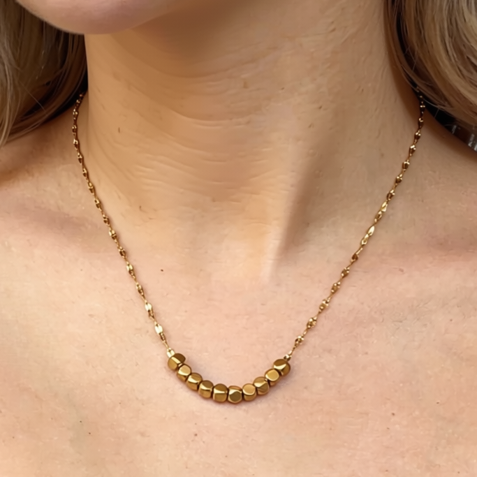 Cada cuenta cuadrada perfectamente pulida, refleja la luz con un brillo sutil y sofisticado, creando un juego visual moderno y atemporal.