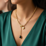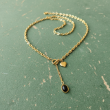 Collar de cadena en acero quirúrgico con cierre delantero. La pieza se realza con un delicado colgante en forma de corazón, símbolo de estilo y sencillez. Como detalle adicional, un alargue de cadena desciende suavemente culminando en una piedra de color negro que aporta contraste y un aire sofisticado. El diseño combina modernidad y equilibrio, convirtiéndose en un accesorio versátil que acompaña tanto looks cotidianos como ocasiones especiales.