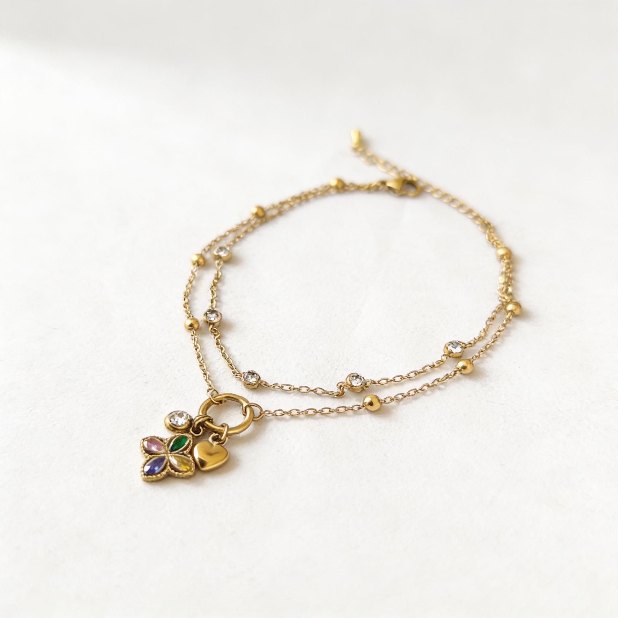 Tobillera diseñada con doble cadena que aporta un aire delicado y sofisticado. Su brillo cálido resalta la piel con sutileza, mientras que una pequeña piedra verde, de tono intenso y luminoso, se convierte en el detalle protagonista: un acento de frescura que evoca naturaleza y armonía.